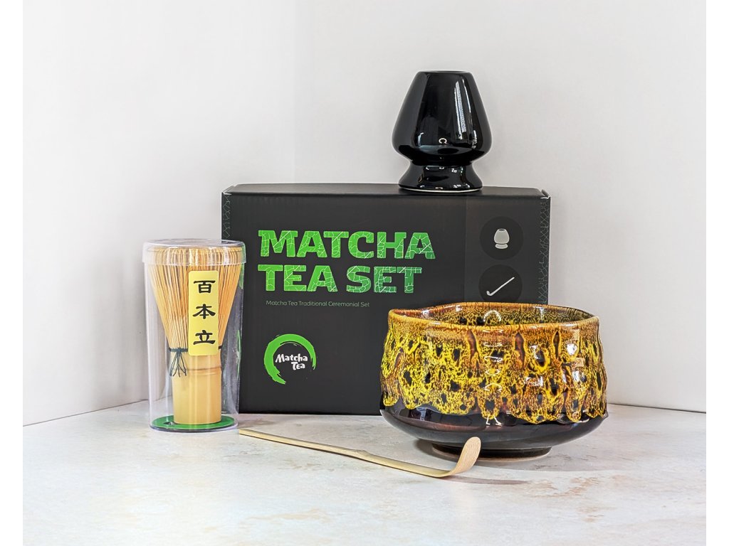 Profi Matcha set Akeno je rozšířená verze dárkové sady se stojánkem na metličku. Obsahuje keramický čawan s černá glazura, bambusovou lžičku, bambusovou metličku a keramický stojánek. MOC 1 379 Kč — prémiový dárek pro náročné zákazníky.
